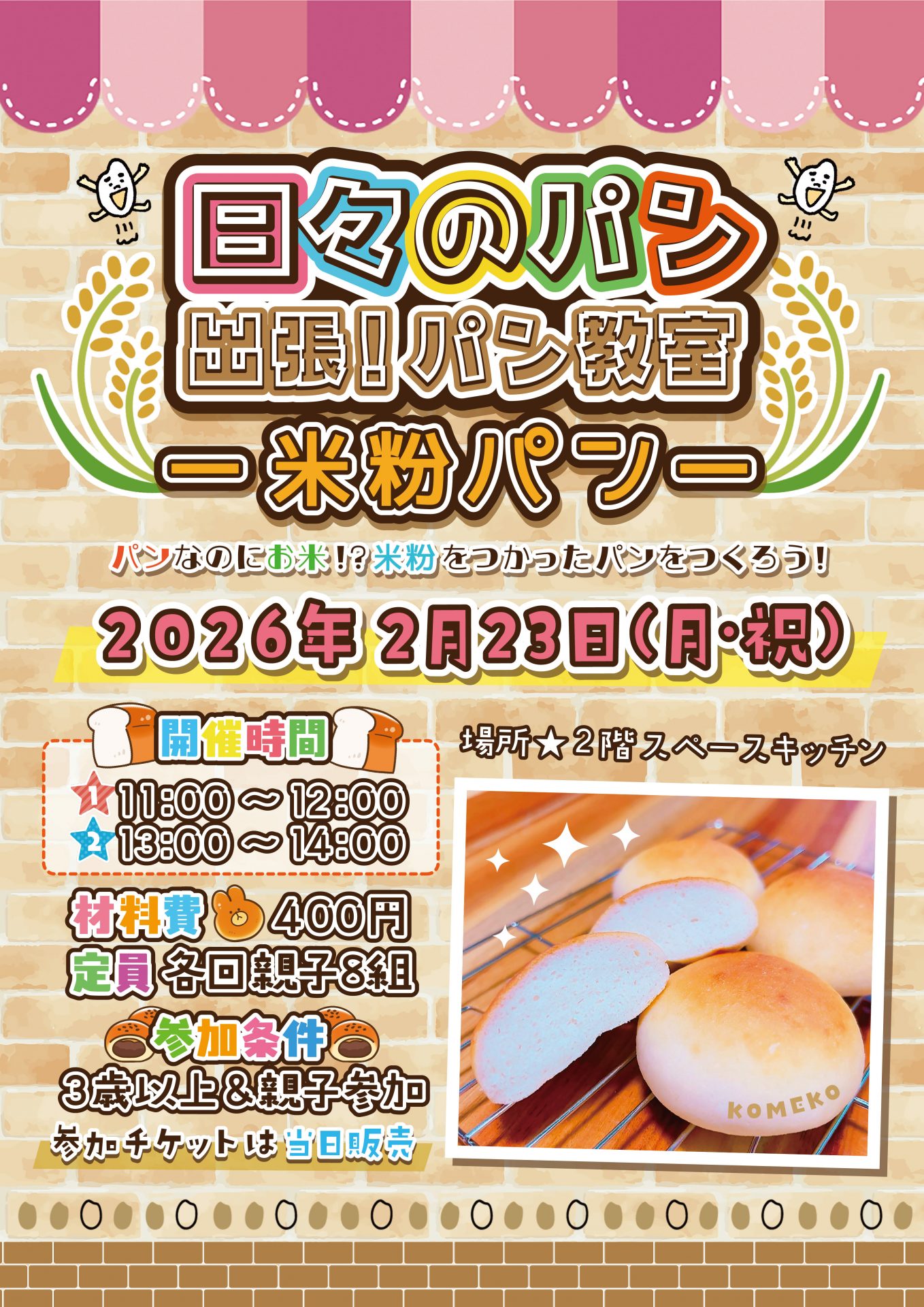 スペースキッチン スペースキッチン|2026年2月23日(月・祝)「日々のパン 出張!パン教室」 2026.01.31 【開催終了】劇場ワークショップ|2026年2月1日(日) 「演劇/ひみつのスタープロ」 前の記事 劇場ワークショップ|2026年2月11日(水・祝) 「ちょっと夢工房」 次の記事