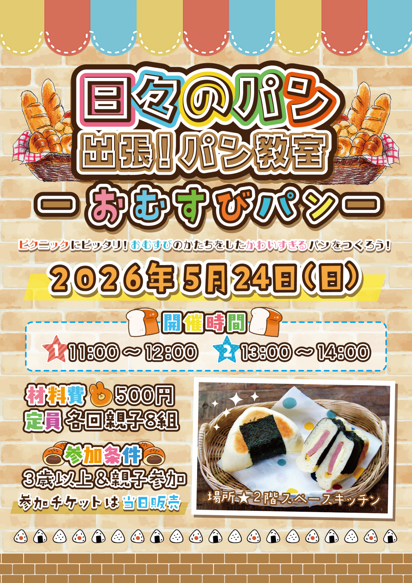 スペースキッチン スペースキッチン|2026年5月24日(日)「日々のパン 出張!パン教室」 2026.04.09 スペースキッチン|2026年6月28日(日)「日々のパン 出張!パン教室」 前の記事 劇場ワークショップ|2026年5月3日~5日「キッズタウンけんせつ広場」 次の記事